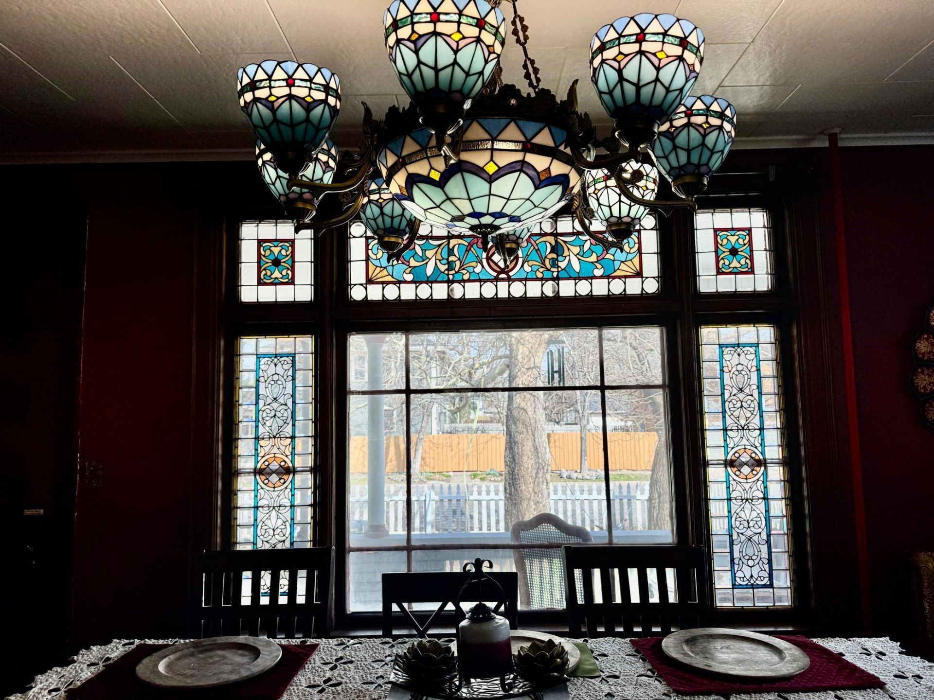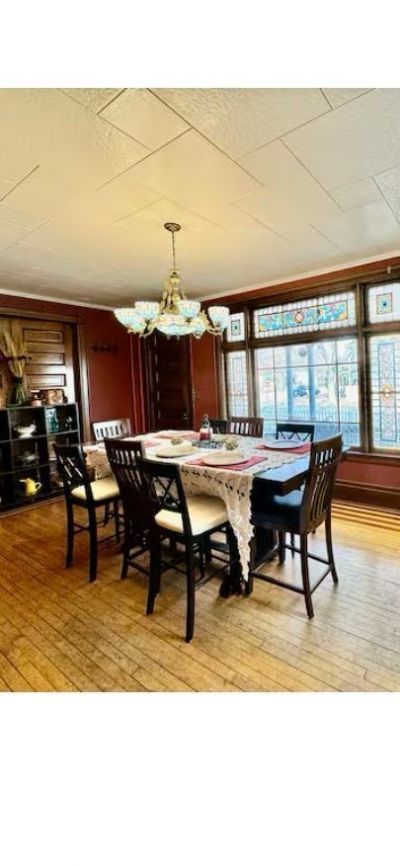 Stained glass windows. Double lot. 4 driveway parking stalls. 3 garage doors, 7 car garage. Carriage house above garage.
